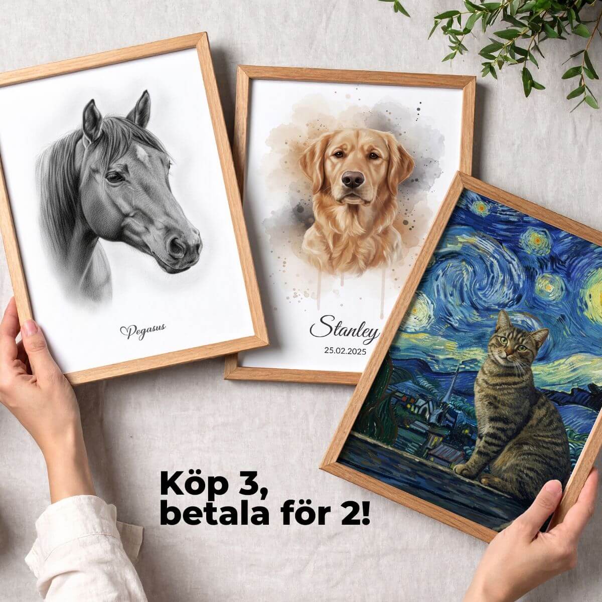 Har du flera husdjur? Lägg 3 eller fler porträtt efter eget val i varukorgen och få automatiskt 1 porträtt på köpet. Ingen rabattkod behövs.